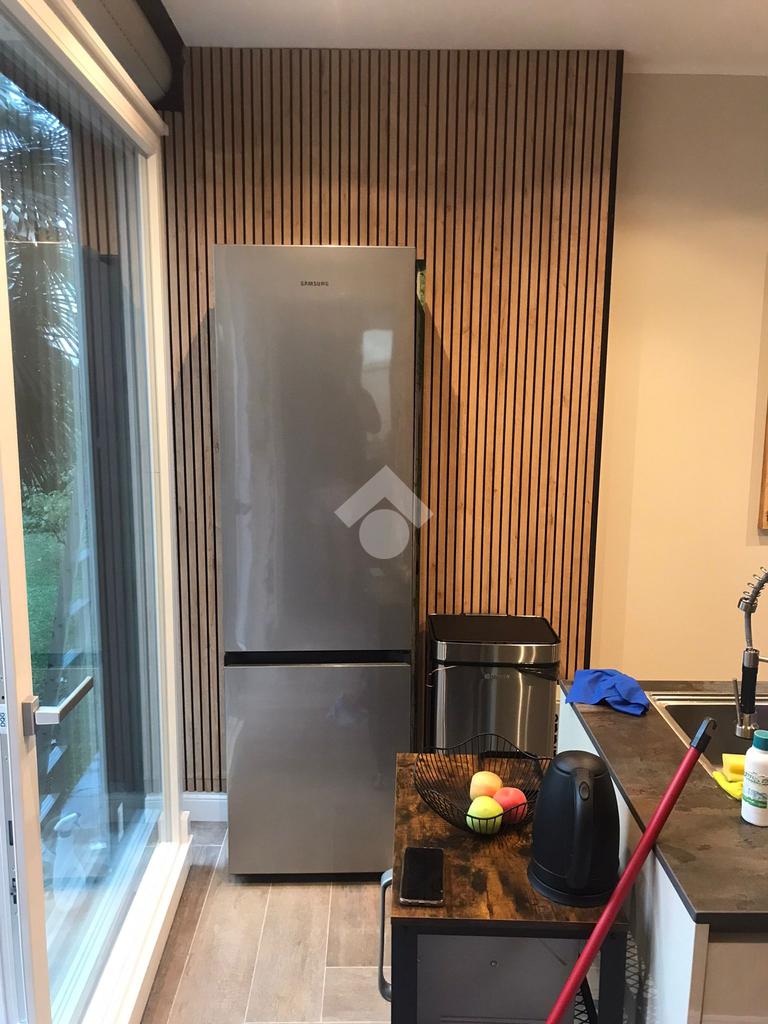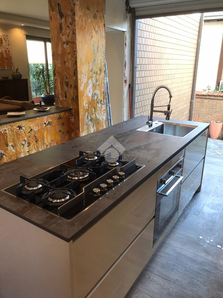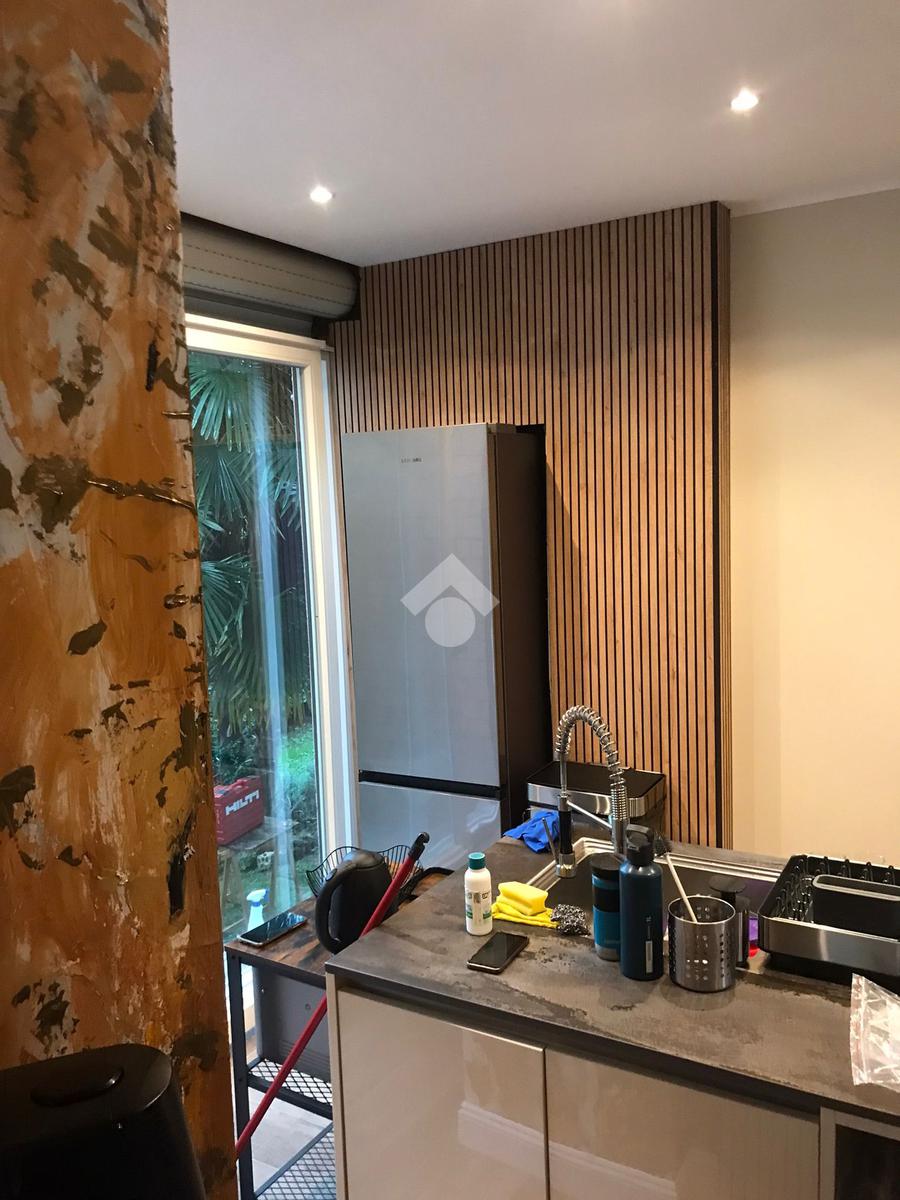 La cucina a vista è moderna e funzionale, con porta finestra che conduce direttamente al giardino privato, perfetto per momenti di relax all’aperto.