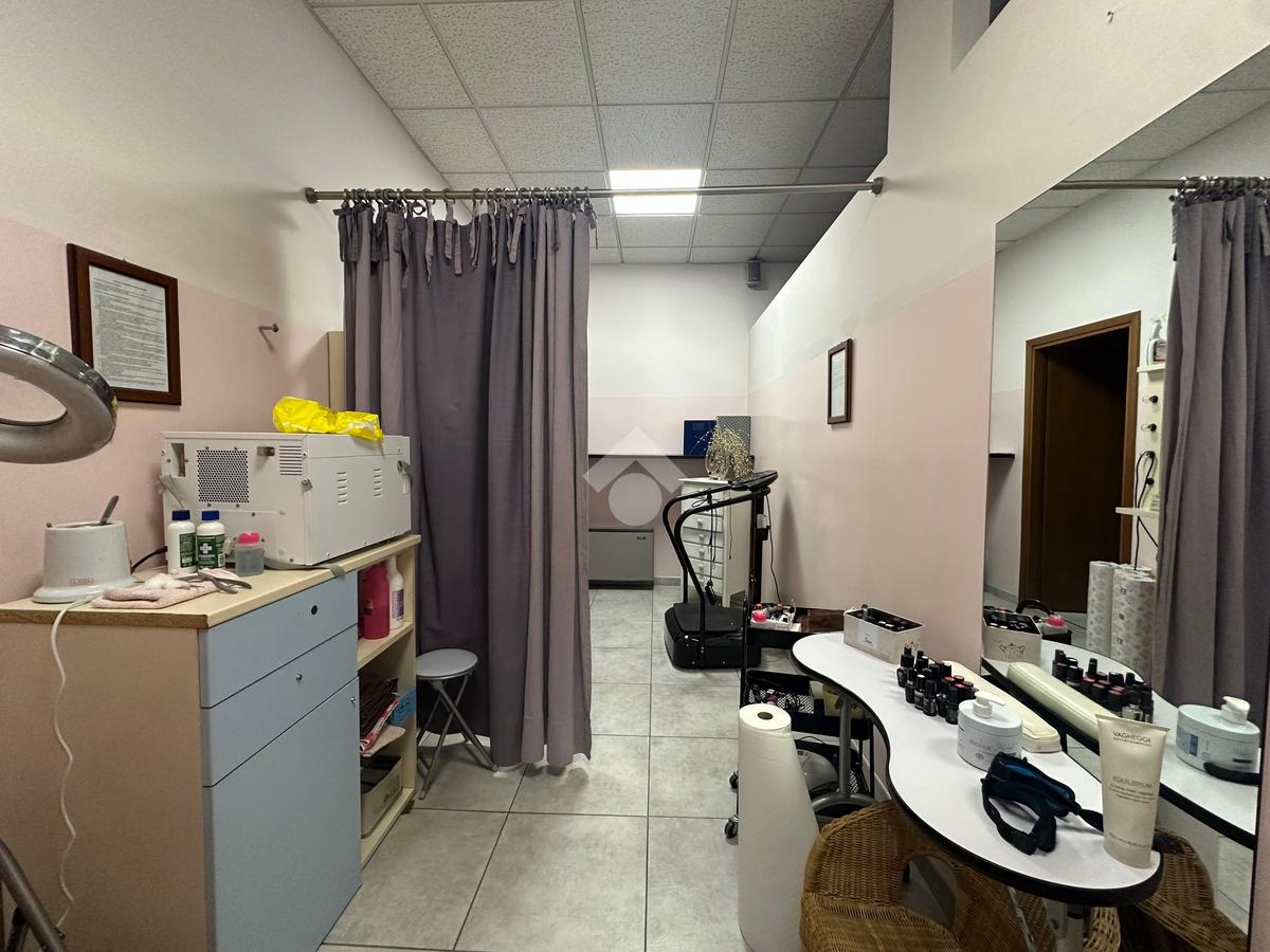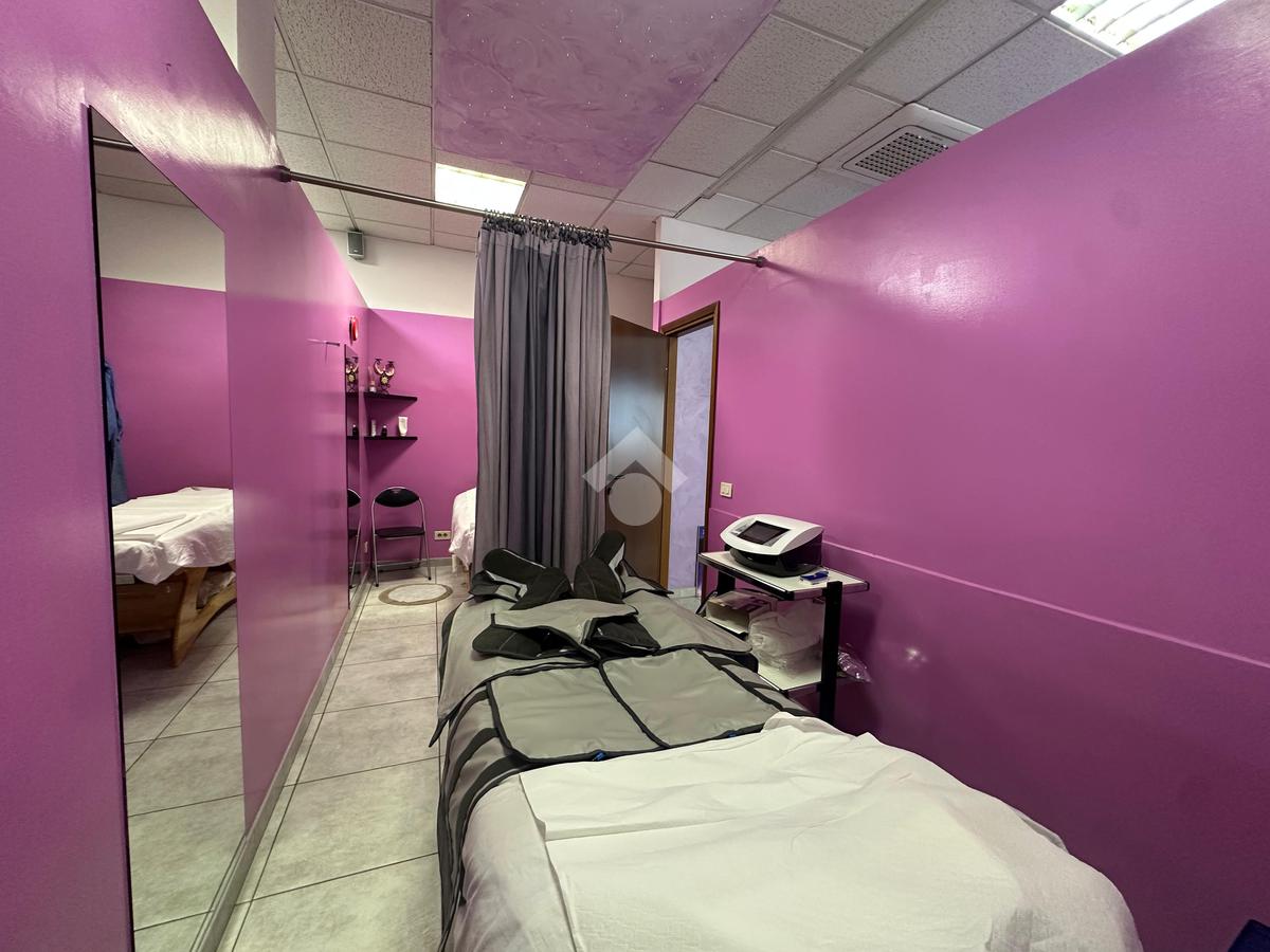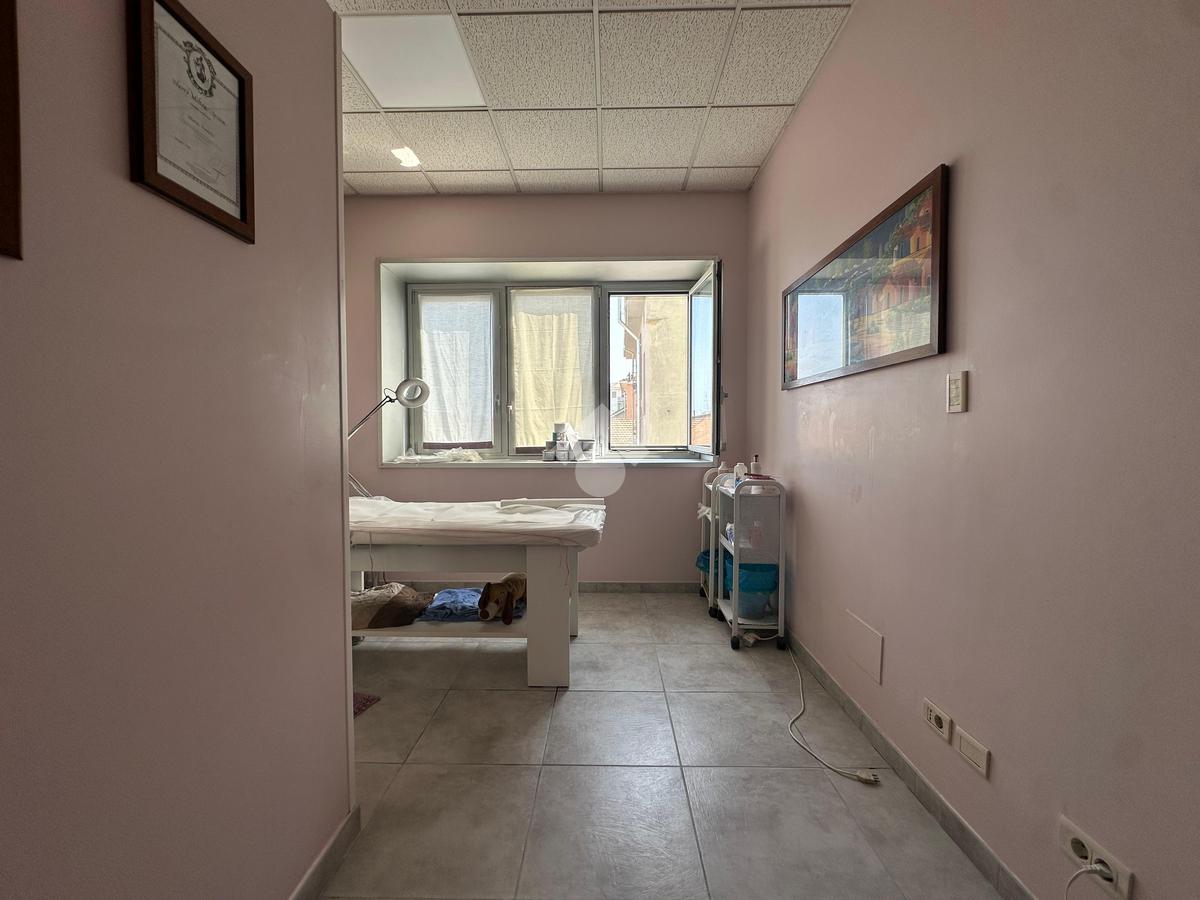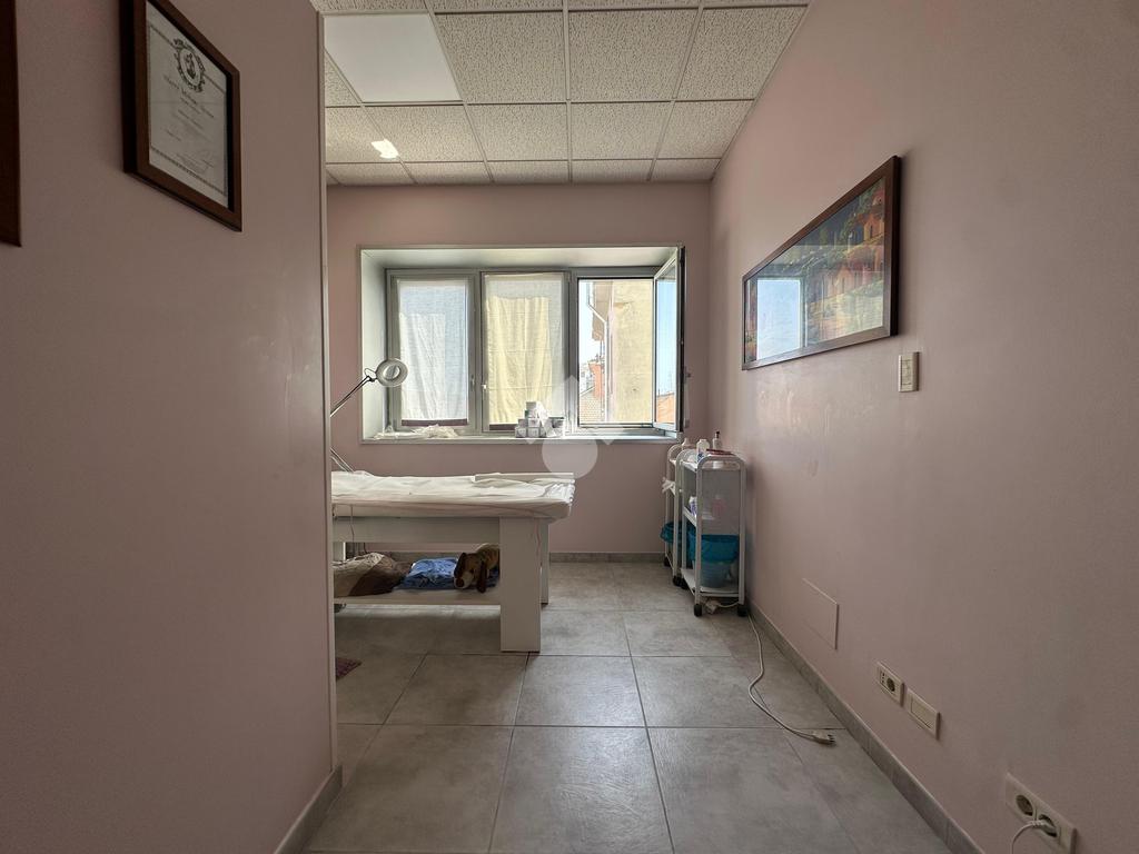 L’accesso avviene tramite un ingresso che conduce a un corridoio centrale dal quale si sviluppano ben dieci stanze, attualmente denominate “cabine”, oltre a una sala d’attesa spaziosa e un bagno con antibagno. Le stanze sono di dimensioni variabili, alcune più ampie, altre più contenute, adattabili a seconda delle esigenze specifiche dell’attività.